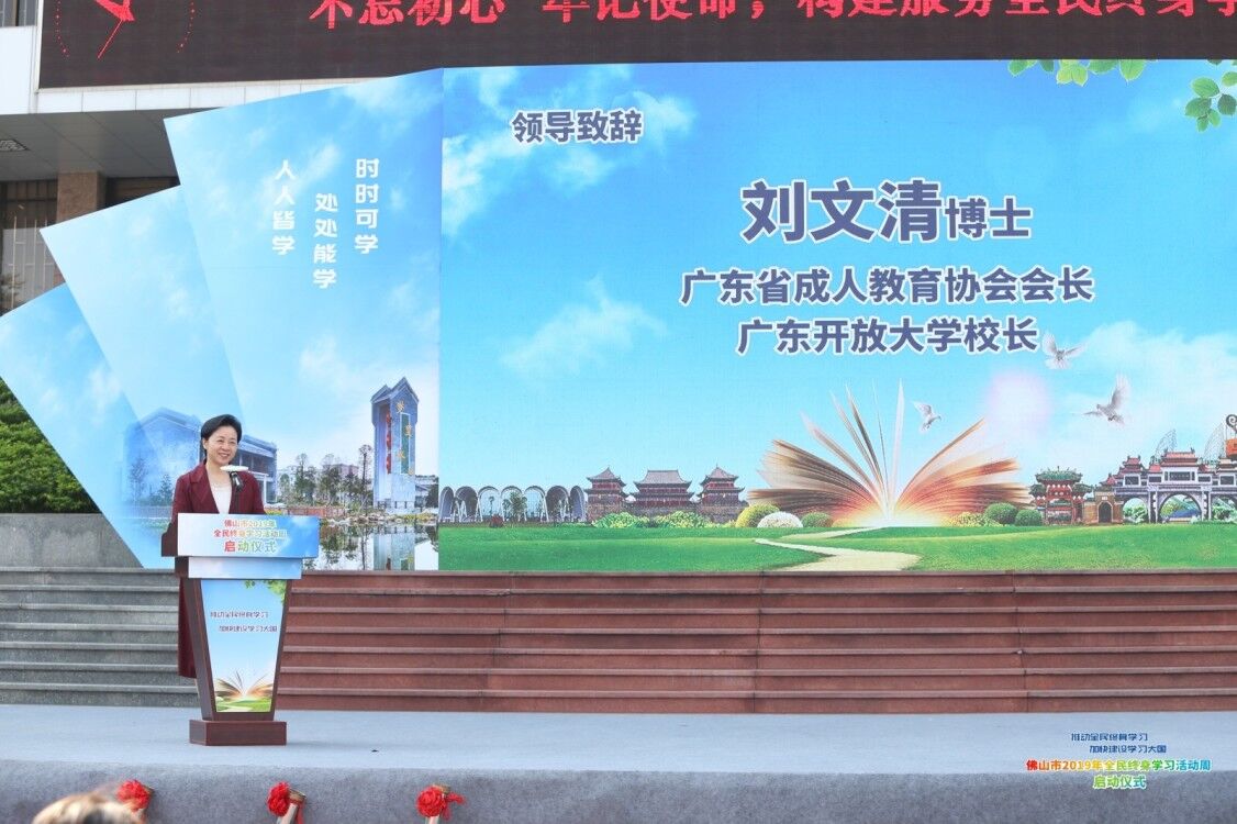 刘文清首先代表广东开放大学、广东省成人教育协会对佛山市2019年全民终身学习活动周启动仪式的顺利举行表示热烈祝贺。刘文清强调,党和国家高度重视学习型社会建设,党的十九大报告明确提出:“办好继续教育,加快建设学习型社会,大力提升国民素质”;刚刚闭幕的党的十九届四中全会也明确提出:“构建服务全民终身学习的教育体系”。刘文清指出,近年来我省在习近平新时代中国特色社会主义思想的指引下,始终紧扣“一带一路”、粤港澳大湾区建设、经济产业转型发展和“四个走在全国前列”等国家和省的重大经济社会发展战略要求,不断改革创新工作方式方法,积极营造全省终身学习良好氛围,努力开创全省学习型社会建设的新局面,取得一系列位于全国前列的显著成就:较早成立广东终身教育学分银行,制定发布全国首个终身教育资历框架等级标准,拥有全国远程开放教育系统最完整的办学体系和最大的在校生规模,率先探索新型老年大学建设等。刘文清认为学习型社会建设已成为佛山市一张亮丽名片,希望今后能做到五个更加:更加向基层社区延伸,更加注重群众满意度,更加注重城乡协调发展,更加注重服务区域经济社会发展,更加注重服务实效。