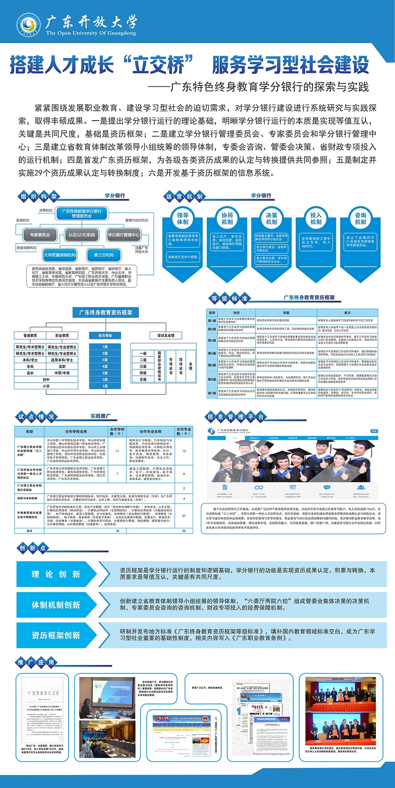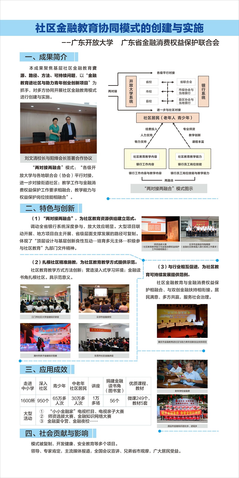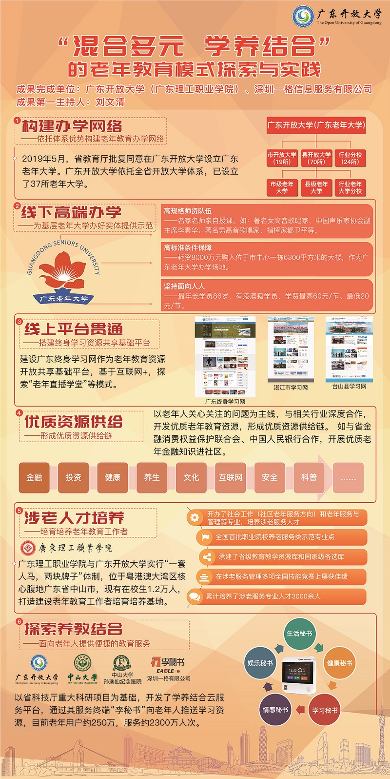11月22日在广州举行的2019年全民终身学习活动周广东省开幕式公布了2019年广东教育教学成果奖“社区教育和老年教育”类评比结果。学校校长刘文清研究员主持的“‘混合多元 学养结合’的老年教育模式探索与实践”和李江研究员主持的“搭建人才成长‘立交桥’,服务学习型社会建设——广东特色终身教育学分银行的探索与实践”均获一等奖;工程技术学院院长王建根教授主持的“社区金融教育协同模式的创建与实施”获二等奖;中山开放大学、佛山开放大学等也有3个主持项目获得二等奖。学校获奖数量高达总设置奖项数的一半,取得历史性突破,也充分体现了省开放大学体系转型发展及学校一流开放大学建设取得的显著成效,具有历史性意义。