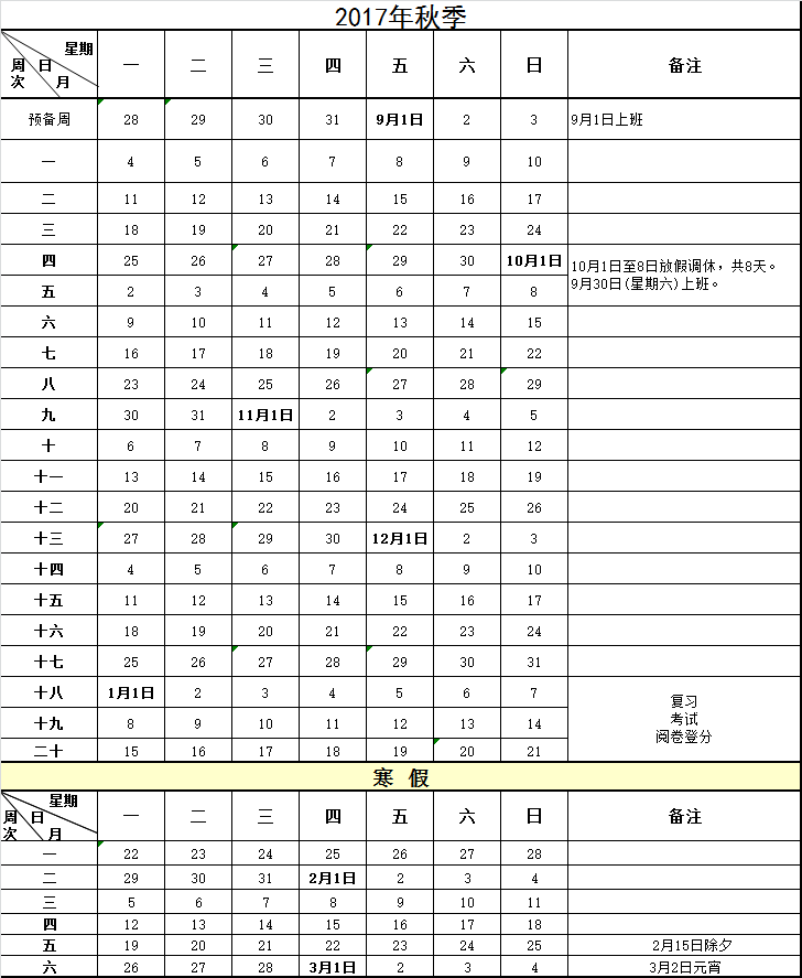 广东开放大学2017-2018学年度第一学期校历