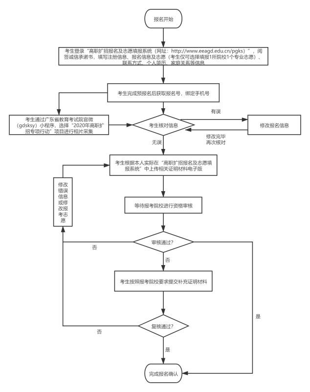 考生登录广东省高职扩招报名及志愿填报系统(http://www.eeagd.edu.cn/pgks),根据系统指引阅签诚信承诺书,填写注册信息、报名信息及志愿信息、联系方式、个人简历、家庭关系等信息,获取报名号、绑定手机号,通过微信小程序采集相片并经核对信息无误后根据实际按照要求上传相关证明材料电子版。高职扩招报名及志愿填报工作全部在网上进行,时间为9月29日9:00至10月9日17:00,逾期不再办理相关手续(报名流程详见附件)。考生仅可填报1所院校1个专业志愿。