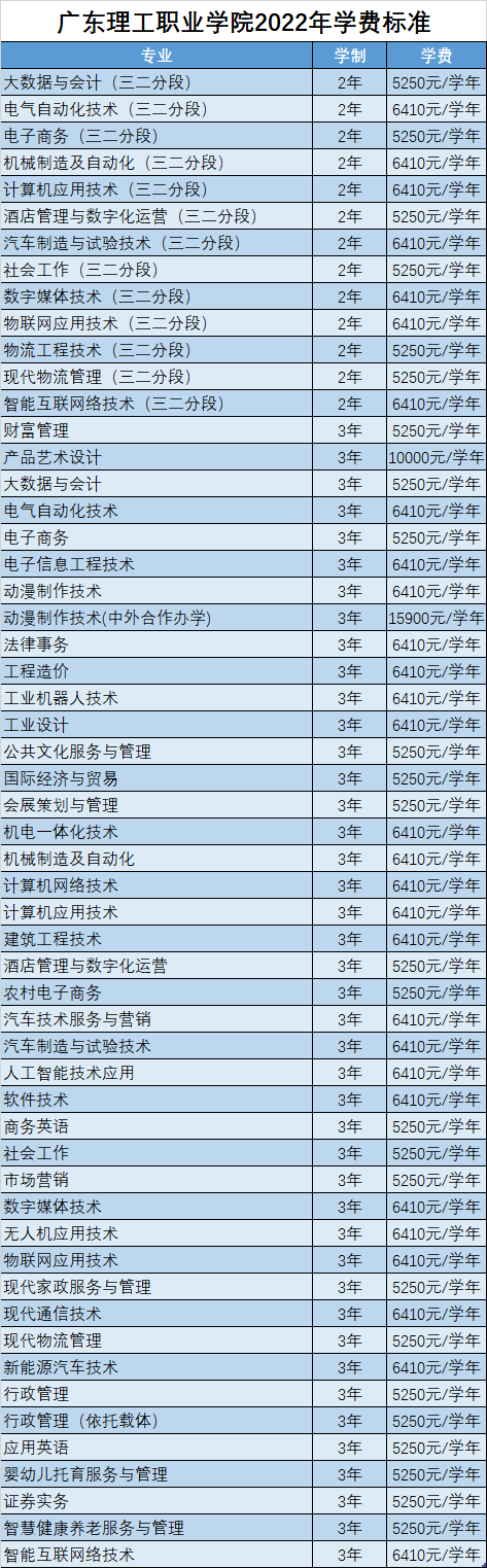 广东理工职业学院2022年各专业学费标准